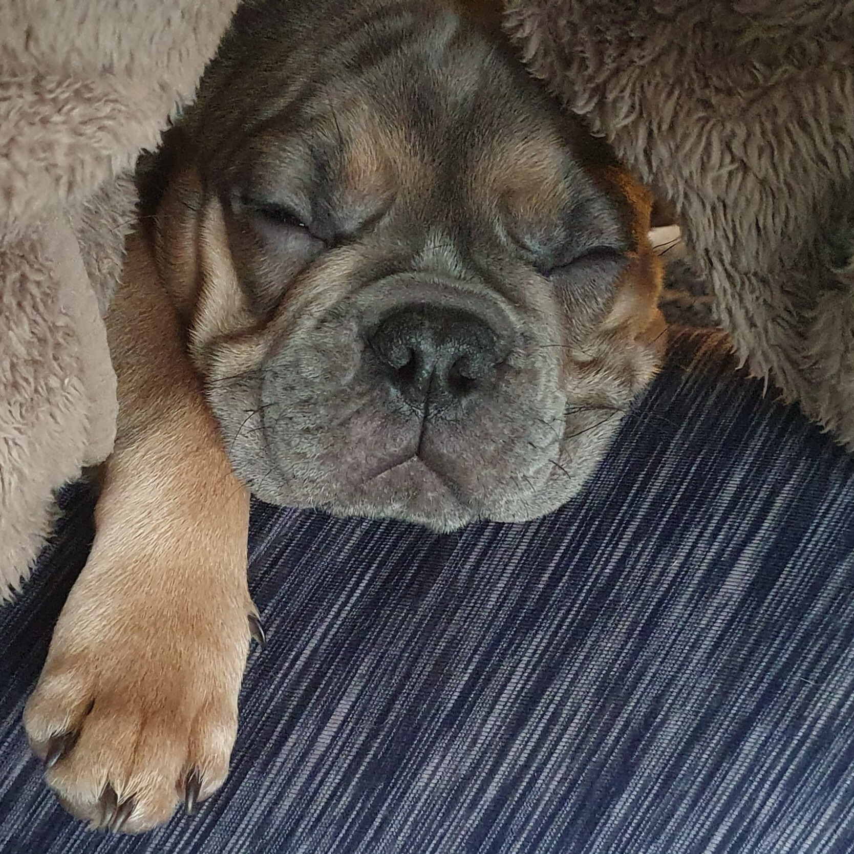 Mijn jonge hond Wolfje, nieuwsgierig en klaar om de wereld te ontdekken, ligt op mijn schoot, in diepe slaap verzonken. Aan mijn zijde ligt Vlinder te slapen.
