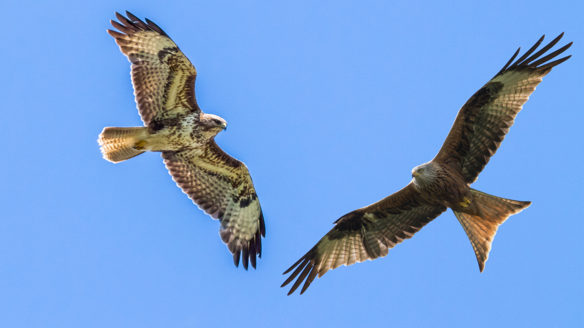 Wat gaat hier gebeuren? Is dit rivaliteit? Pure nieuwsgierigheid? De Buizerd en de Rode Wouw vliegen nu op dezelfde hoogte. Ze zien elkaar. Ze cirkelen. Nog een rondje. Steeds iets dichter langs elkaar, nu zo dichtbij dat ze elkaar kunnen aankijken.